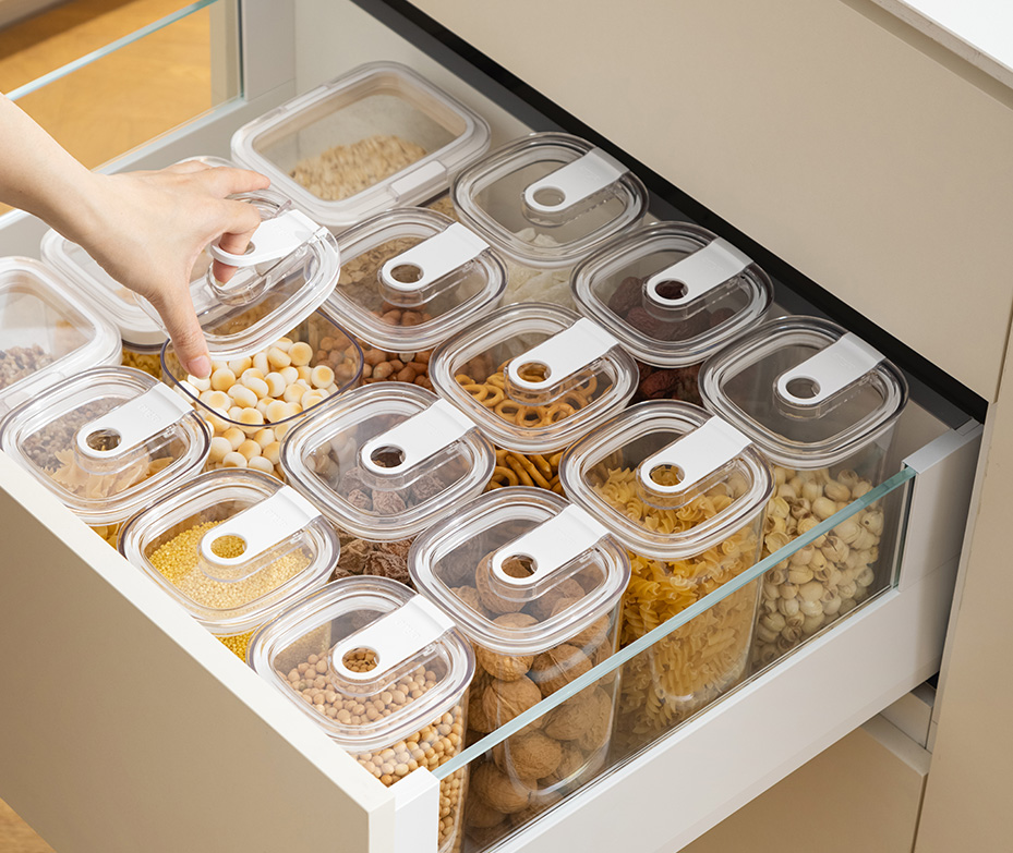 •易拉罐开启方式,单手轻松开盖 • 食品级AS材质 • 透明罐体,便于查看内容物及余量 • 硅胶密封,防潮防虫 • 4种容量,满足不同的收纳需求