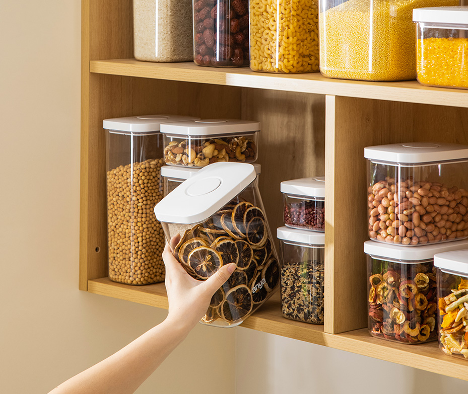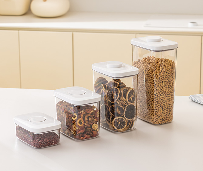 •按压开盖,单手即可操作 •窄边设计,握感舒适,有效利用橱柜纵深空间 •宽开口,方便日常补货 •硅胶密封,防潮防虫不漏水 •有9种尺寸可供选择,以满足您的需求 •非常适合食品收纳和宠物食品储存