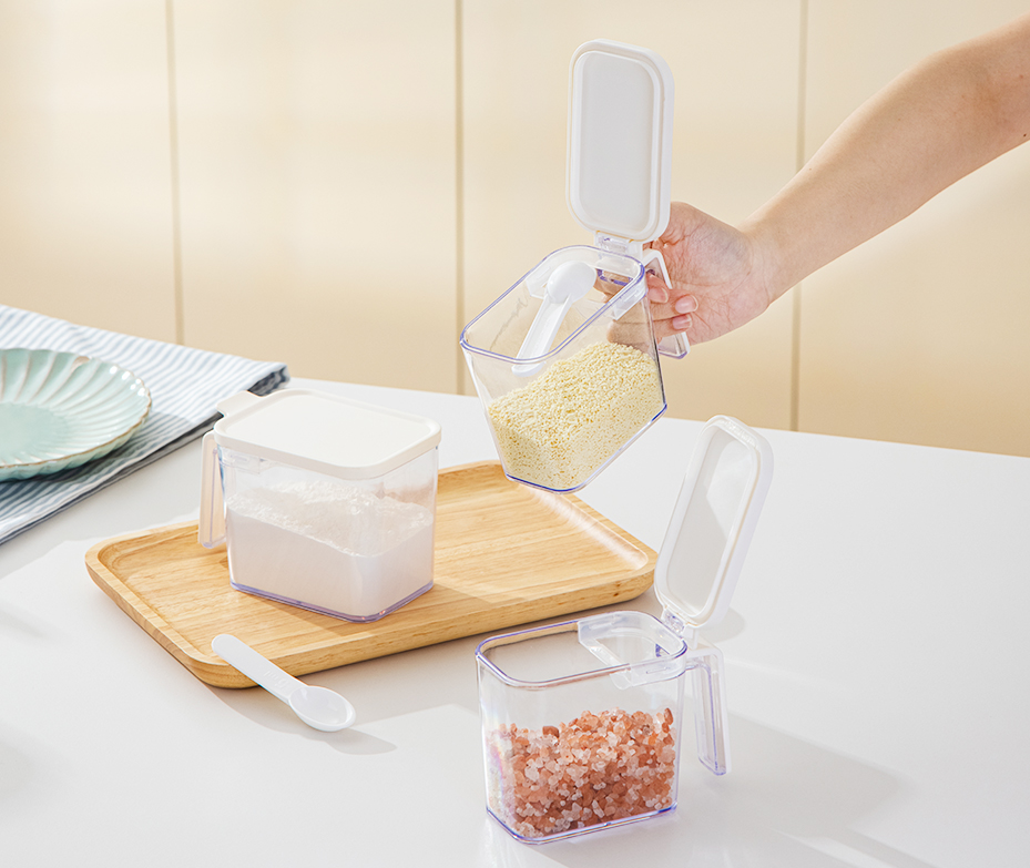 •400ml大单格,轻松装入一包盐; •一键弹盖设计,开盖不费力; •食品级密封硅胶圈,防潮防结块; •2ml独立小勺子,带刮平设计,减盐控糖更健康;
