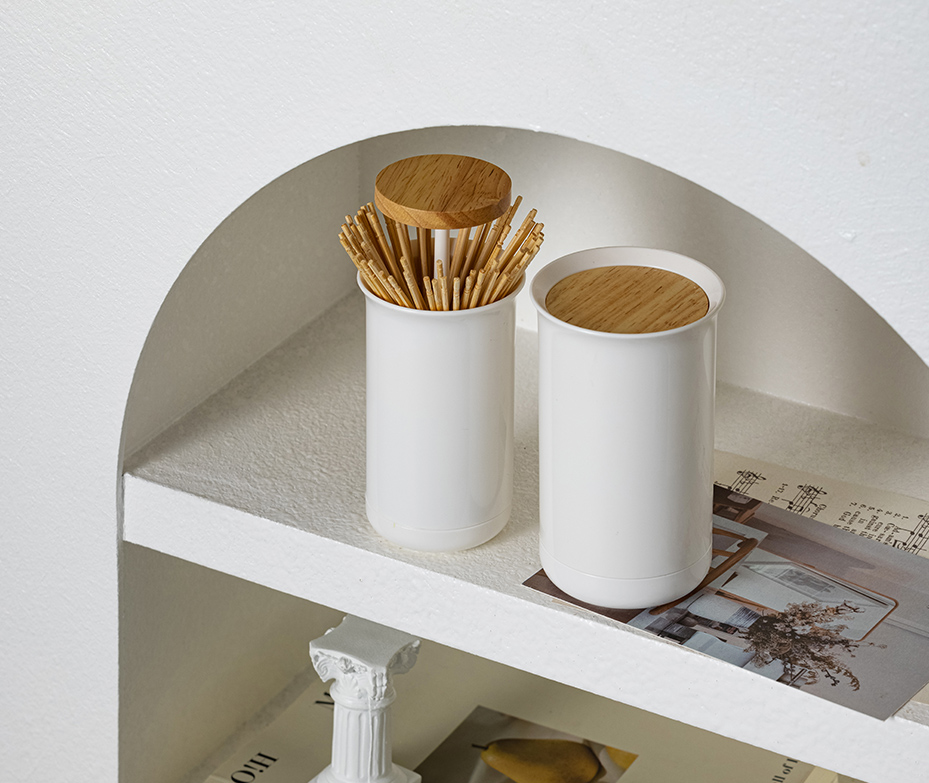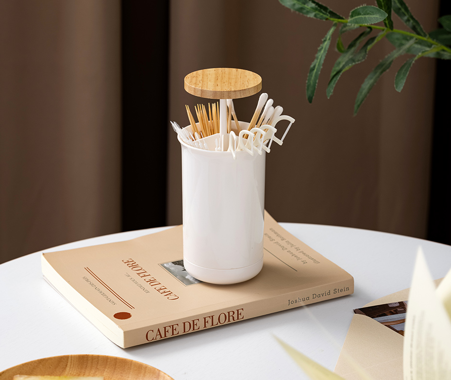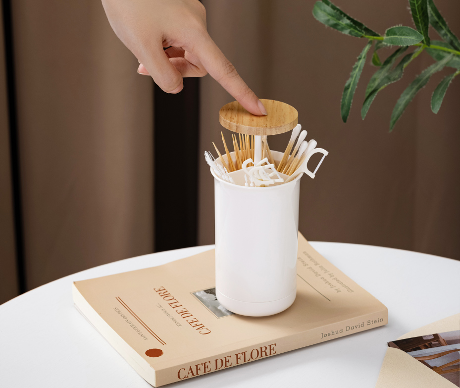 •一键按压升降,轻松取用 •分格收纳,放置不凌乱 •大空间,棉签牙签均可方 •实木装饰盖,造型简约颜值高