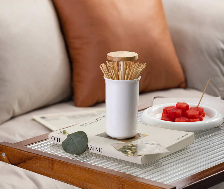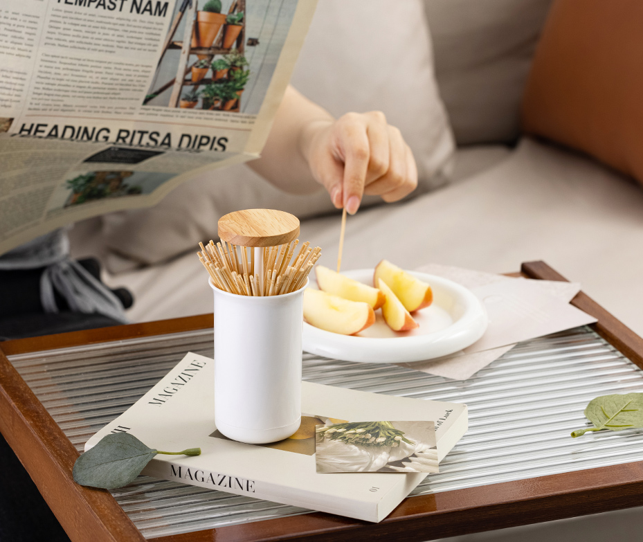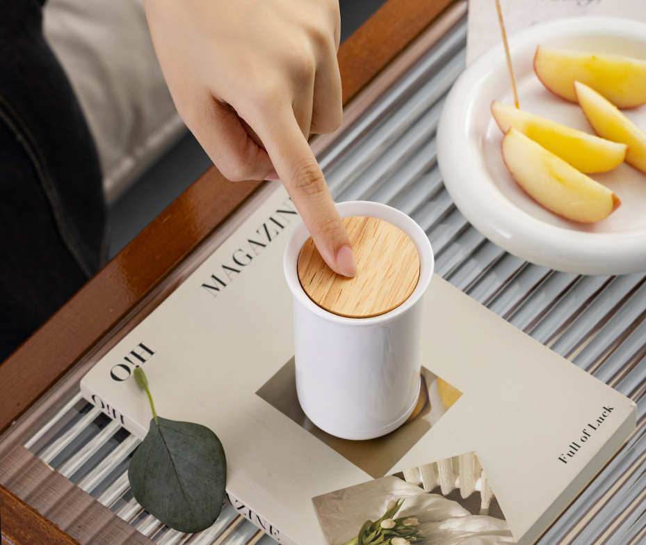 •一键按压升降,轻松取用 •分格收纳,放置不凌乱 •大空间,棉签牙签均可方 •实木装饰盖,造型简约颜值高
