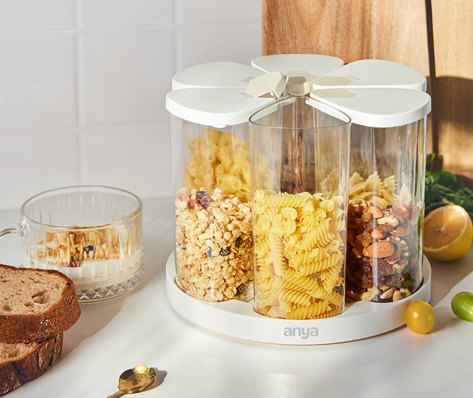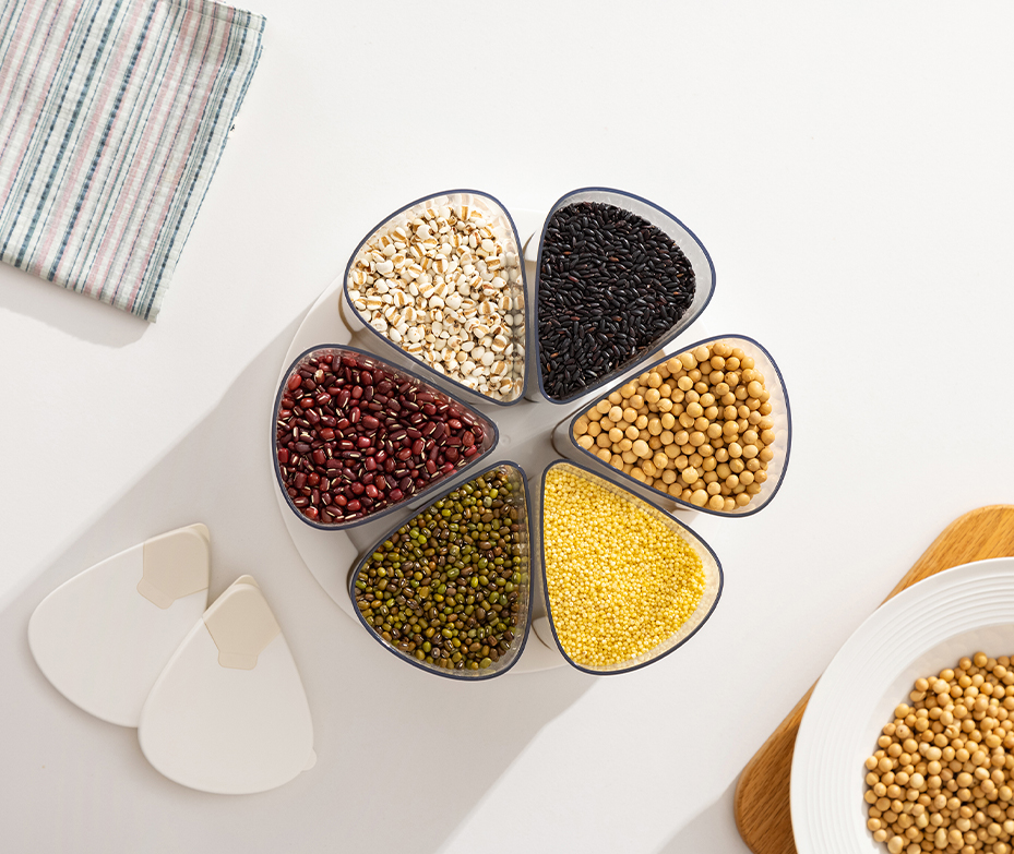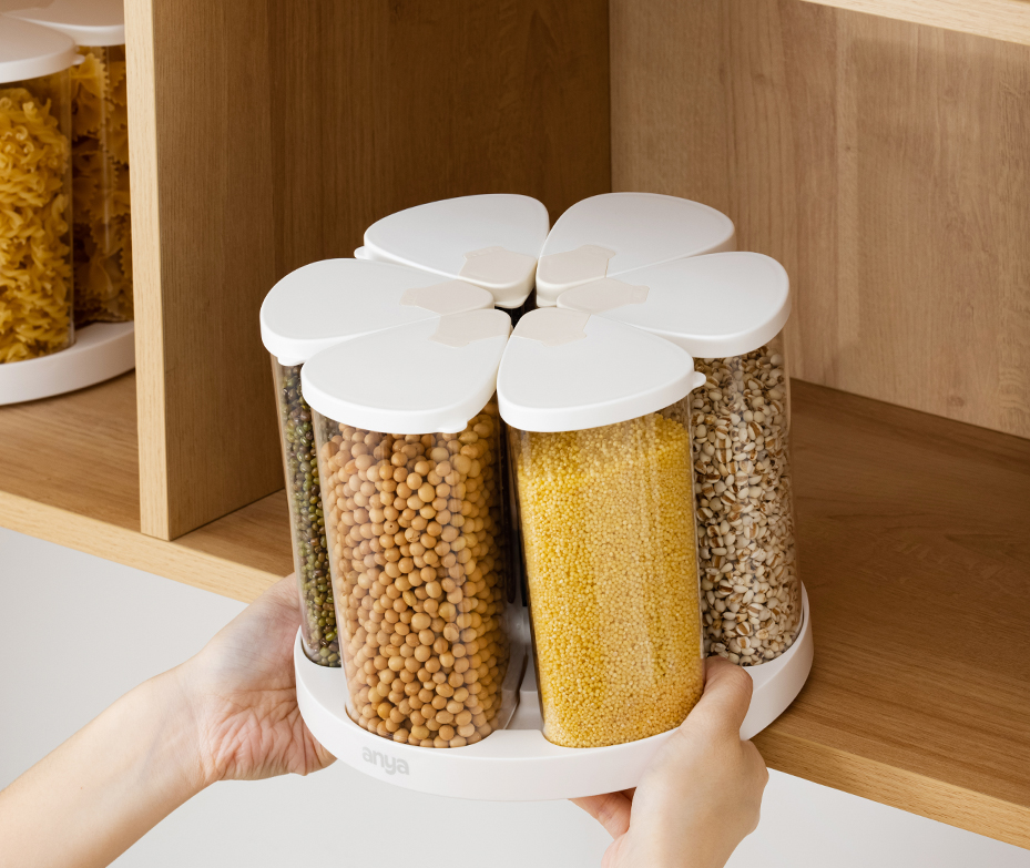 ·360°旋转无遮挡,一转可拿 ·6个可拆卸独立密封罐,分区储存,集中收纳 ·两种开盖方式,小盖口倒出不易洒,大盖口便于补货 ·单个容量650ml,满足日常所需