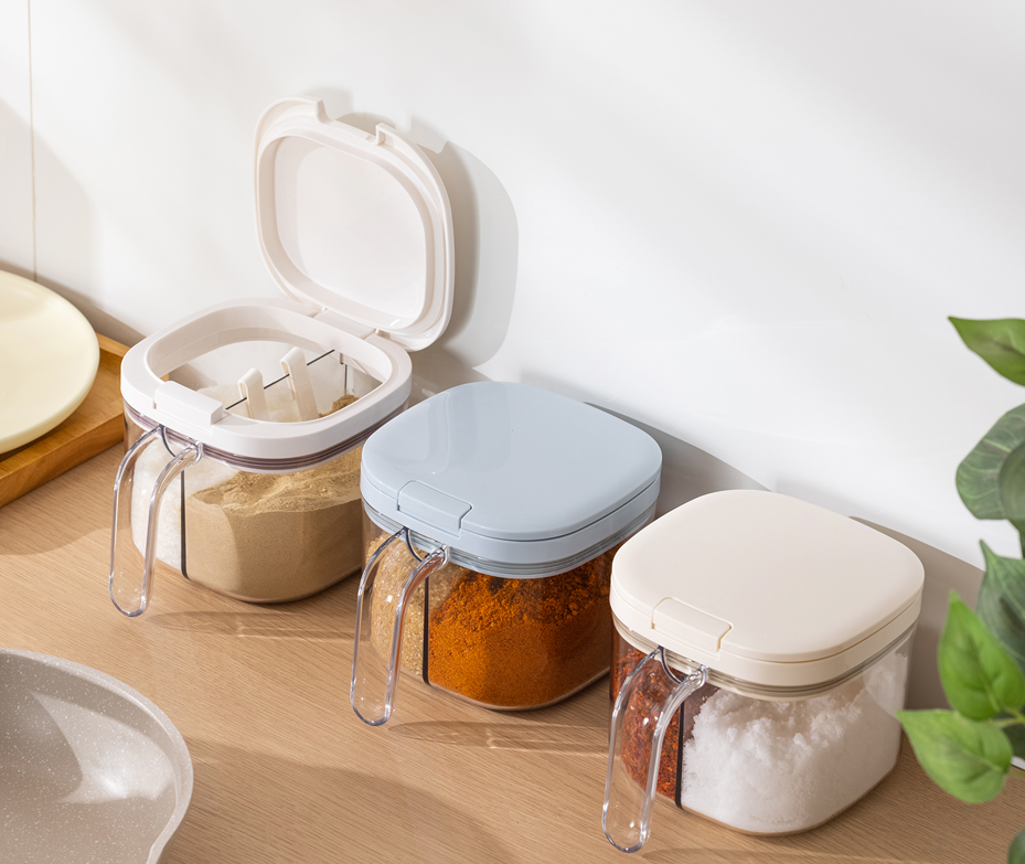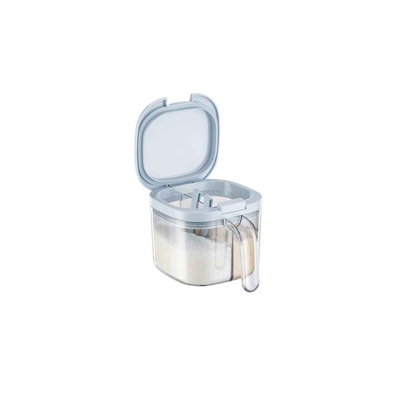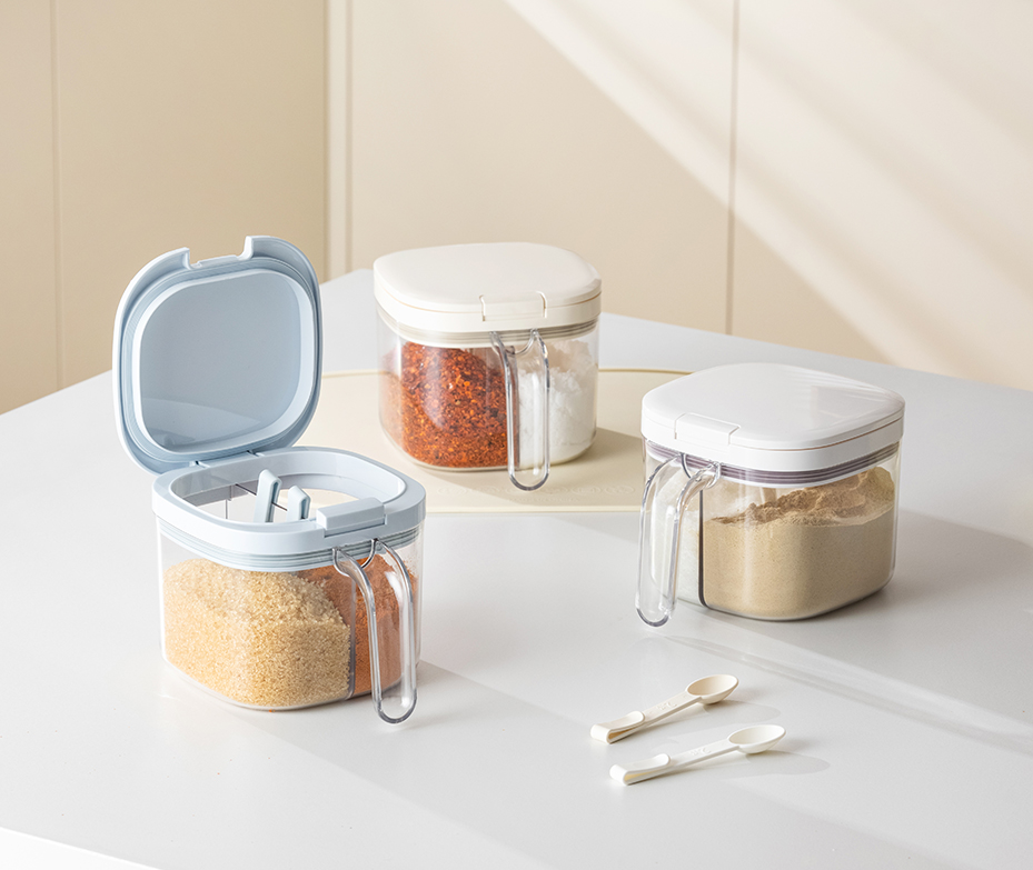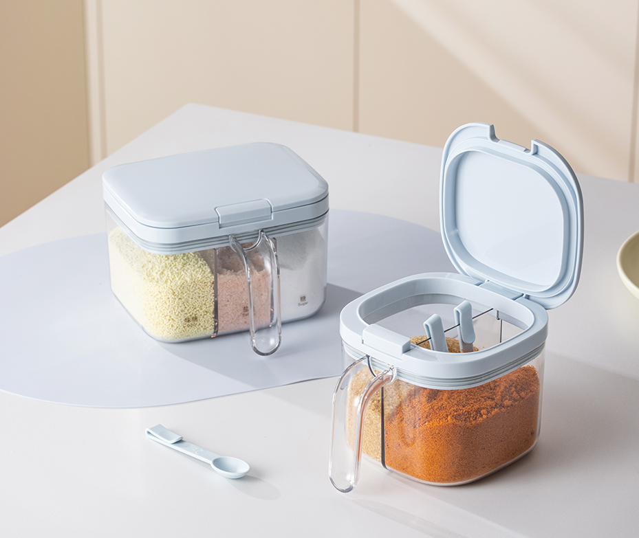 •一体双分格(800ml),调料取用方便快捷; •470ml大单格,轻松装入一包盐; •一键弹盖设计,开盖不费力; •食品级密封硅胶圈,防潮防结块; •2ml独立小勺子,带刮平设计,减盐控糖更健康; •可拆卸设计,盖身分离,清洗更方便; •食品级PET材质,环保无异味,质感通透颜值高;