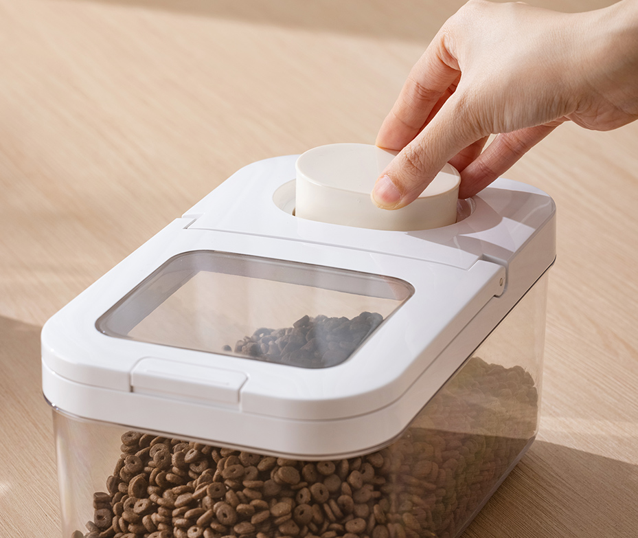 •一键盖子弹开,单手即可操作 •勺子和内容物分离设计,避免手与内容物直接接触造成二次污染 •硅胶圈双重密封,防潮防虫不漏水 • 超窄边设计,适合窄缝收纳,提升垂直空间利用 • 大开口,便于日常消耗补充 • 适用于各种食品及宠物粮收纳